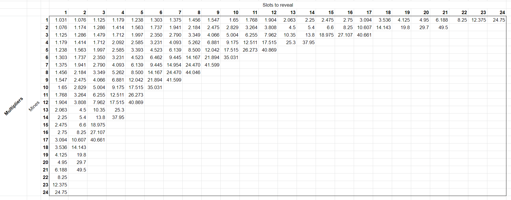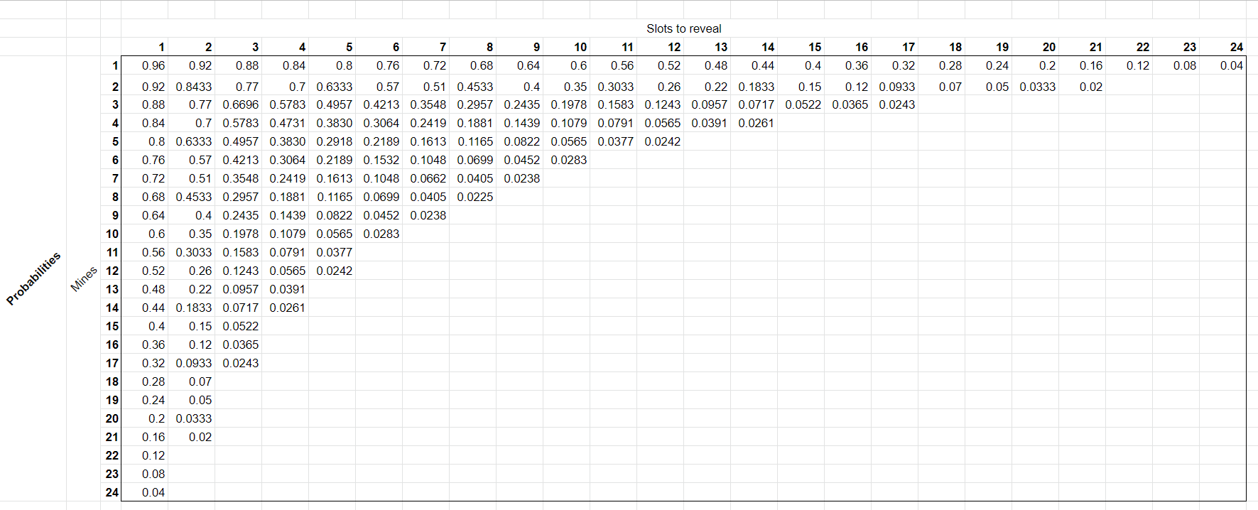 The probabilities for a player to win a Mines game with a specific pre-chosen amount of mines and selected tiles (revealed slots) are calculated and shown in the table below: